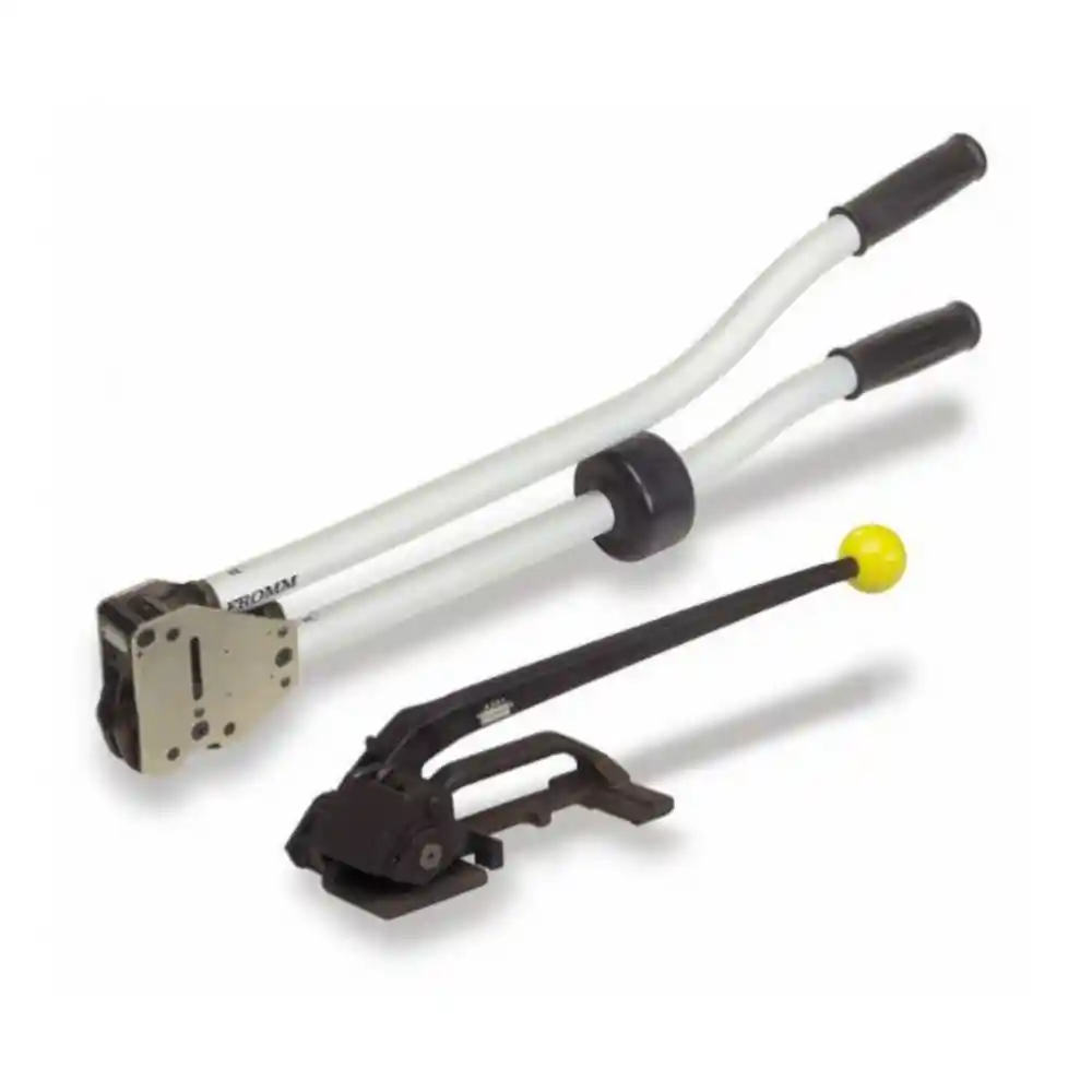 The FROMM A301 is well known because it is specially designed for flat packages and objects. The feed wheel tensioning system allows unrestricted strap feed without the loss of tension. The FROMM A412 is a manual sealer. Using this, the double notch joint is produced in one operation. These 2 tools are used together to produce the perfect notch joints thanks to the built in safety pawl. The ideally curved levers prevent the handle from jamming which prevents any hand injured from happening. The rubber spacer on the lower level allows sealing with both hands on the upper level.